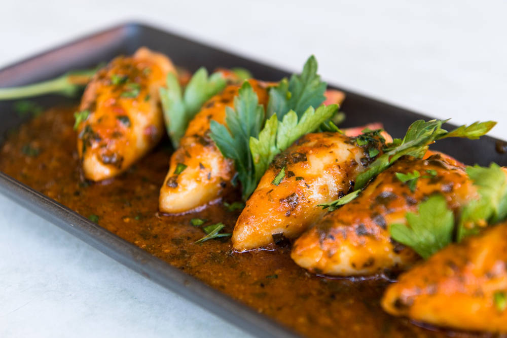 STUFFED WITH PRAWNS, SQUID AND SNAPPER, COATED IN A CHARDONNAY AND SAFFRON CREAM SAUCE AND SERVED WITH CRAB, PRAWNS AND CHERRY TOMATOES.