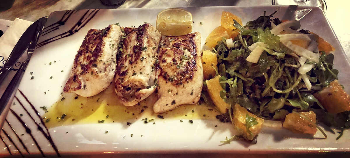 WRAPPED IN A MIXTURE OF BREADCRUMBS, OLIVES AND CAPERS SERVED WITH ROCKET, FENNEL AND ORANGE SALAD.